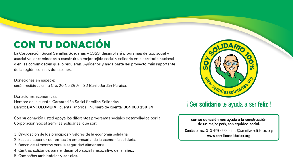 La Corporación Social Semillas Solidarias tiene el gusto de invitarlo a hacer parte del proyecto más importante de la región, basado en los principios y valores de la economía solidaria; ayudando a la construcción de un mejor país, comprometidos con el desarrollo social asociativo y solidario.
